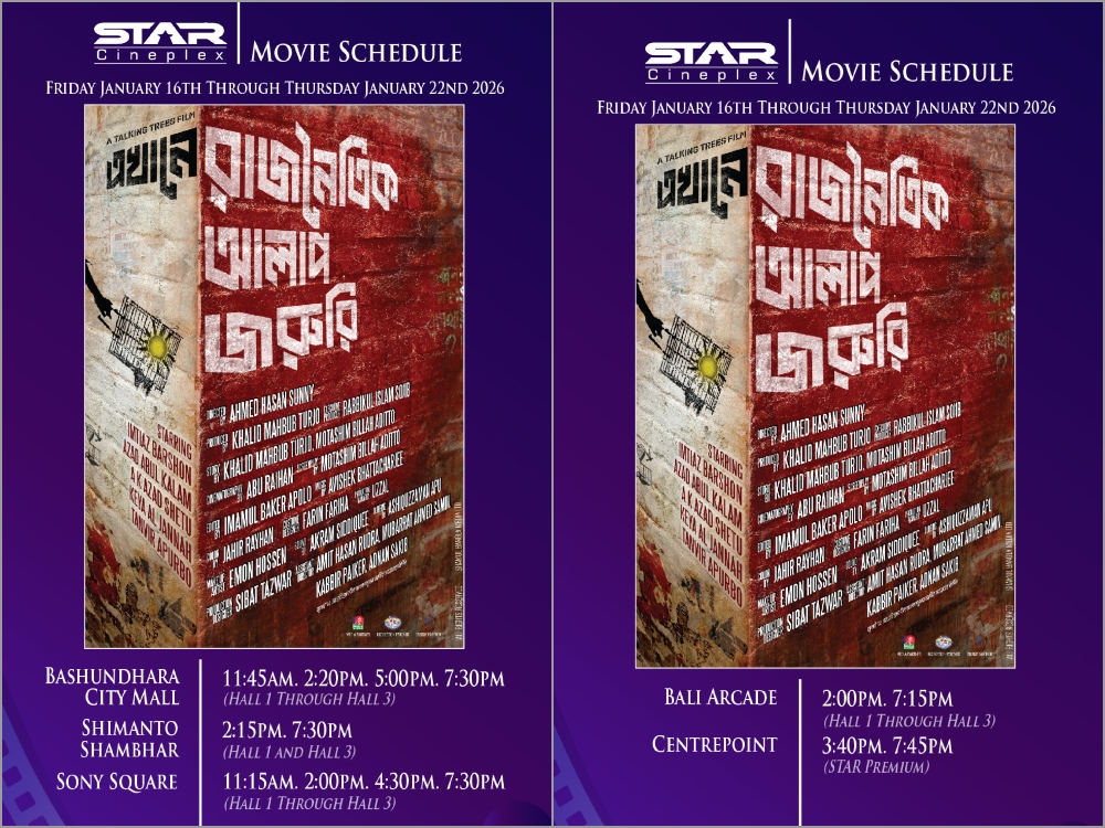 স্টার সিনেপ্লেক্সে ‘এখানে রাজনৈতিক আলাপ জরুরি’ সিনেমার প্রদর্শনীর সময়সূচি