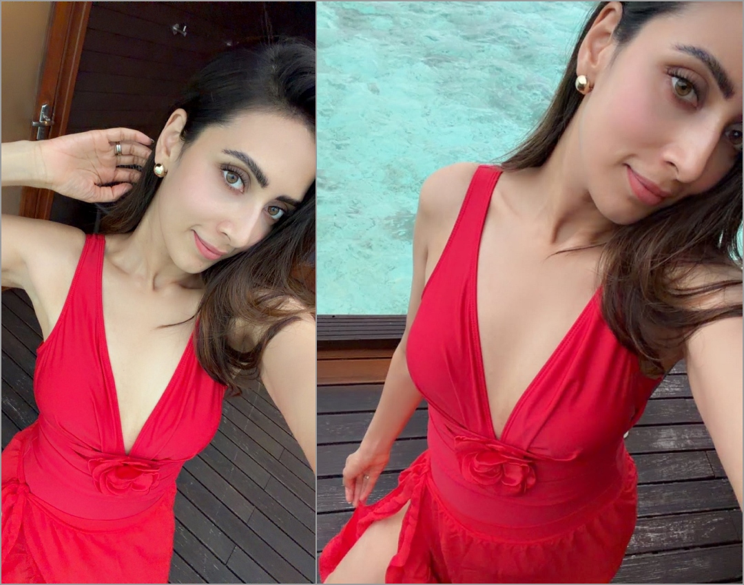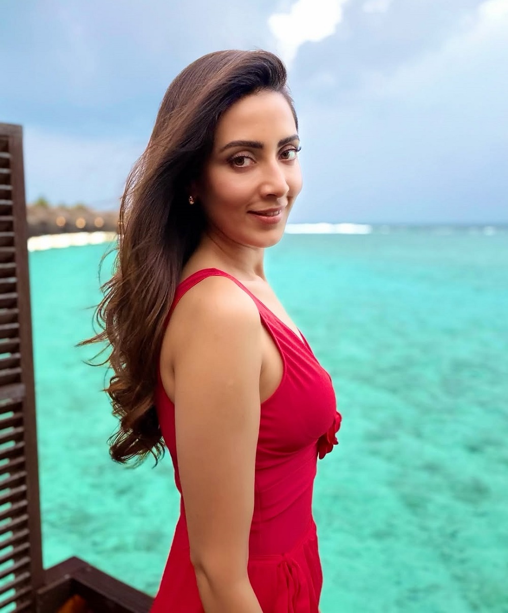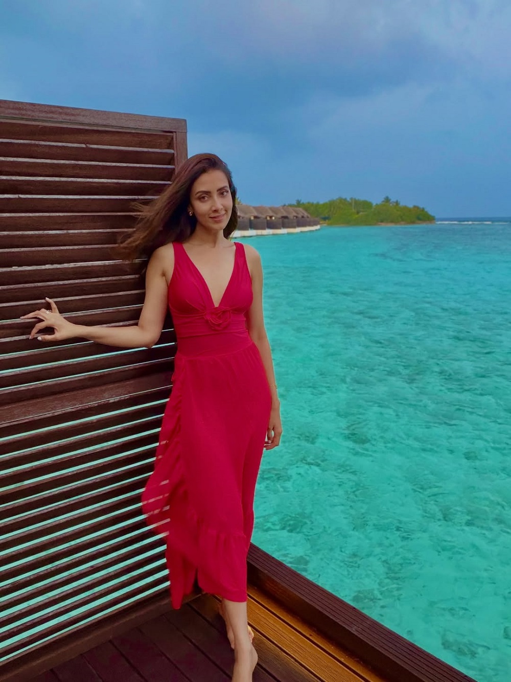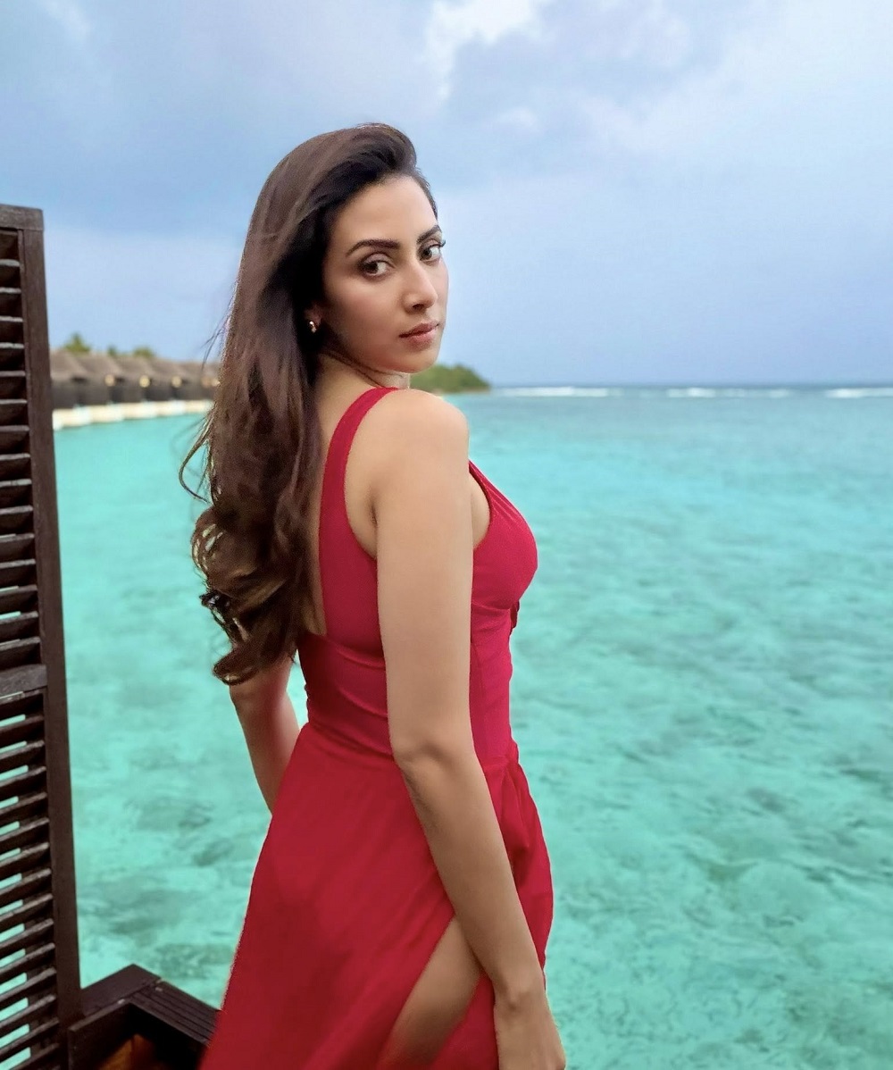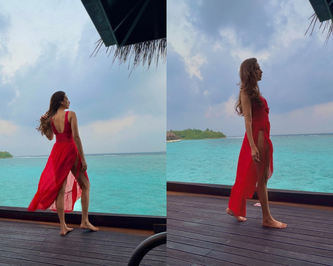 মালদ্বীপে সাগরপাড়ে লাল রঙের স্লিভলেস গাউনে বিদ্যা সিনহা মিম।