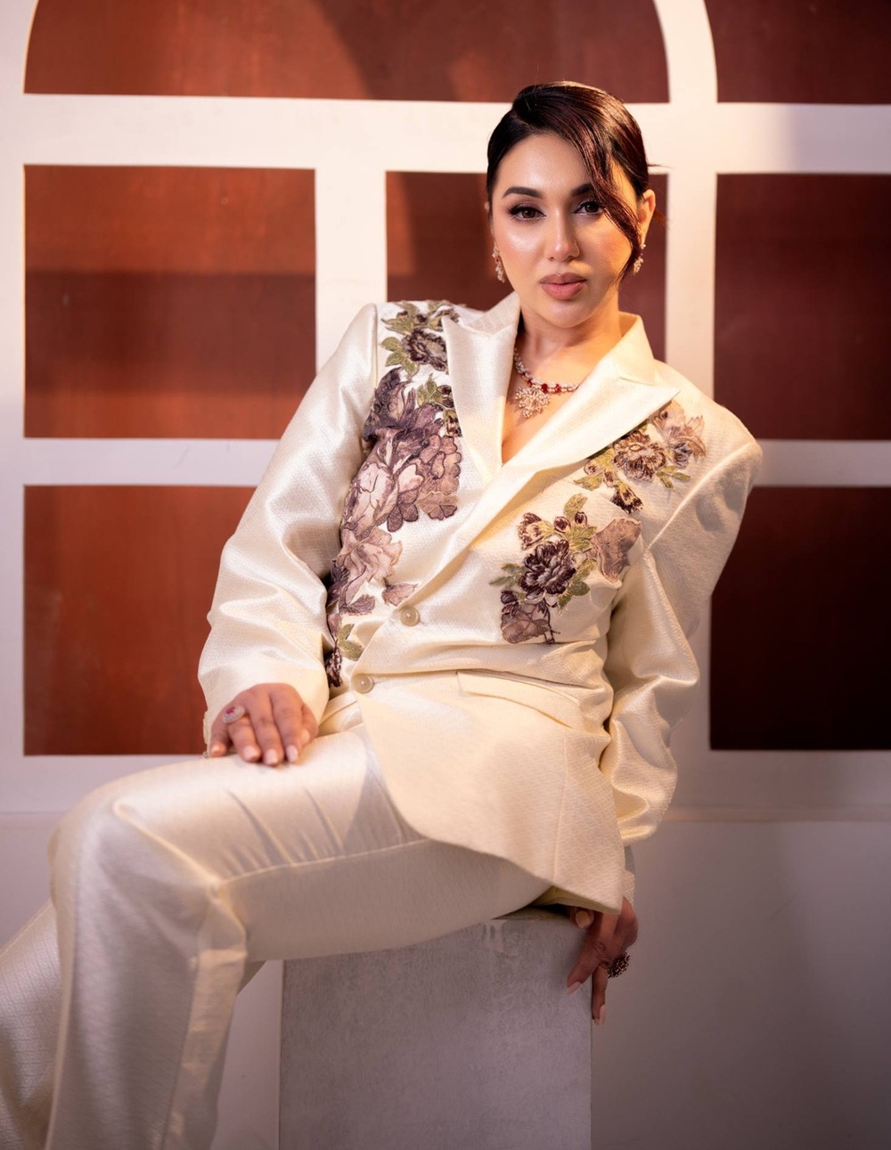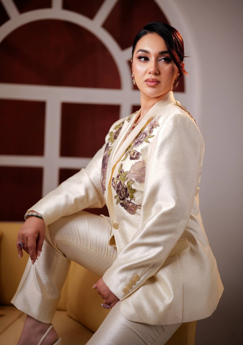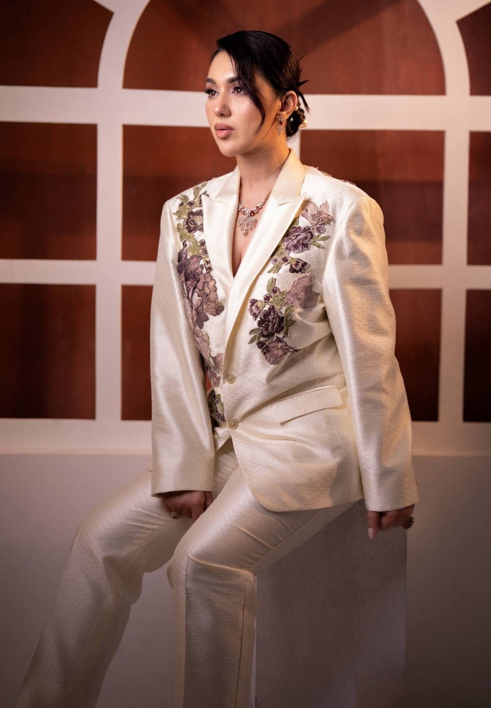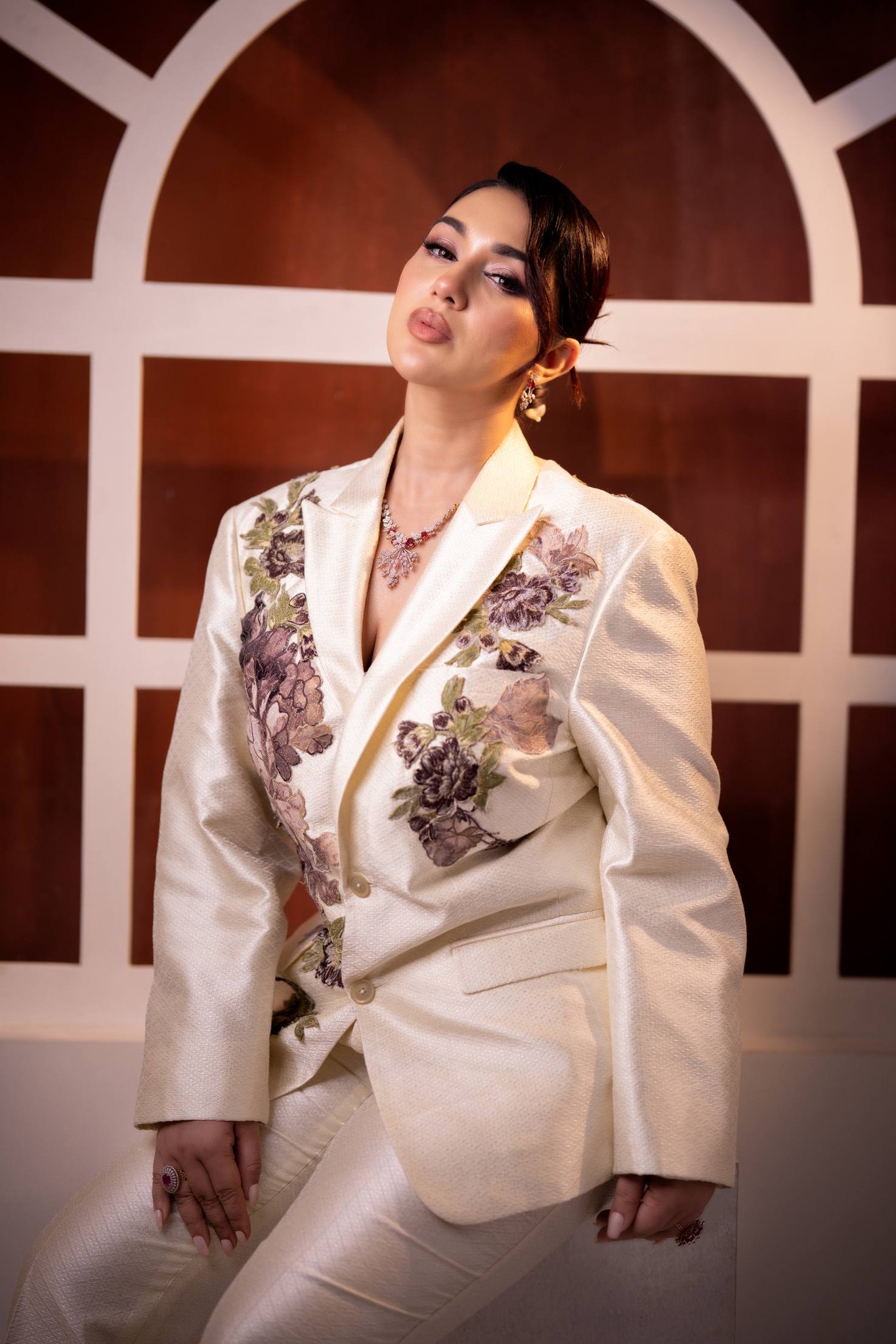অপু বিশ্বাসকে অফ-হোয়াইট স্যুট-প্যান্টে দারুণ মানিয়েছে। স্যুটে রয়েছে ফ্লোরাল এমব্রয়ডারির সূক্ষ্ম কাজ।