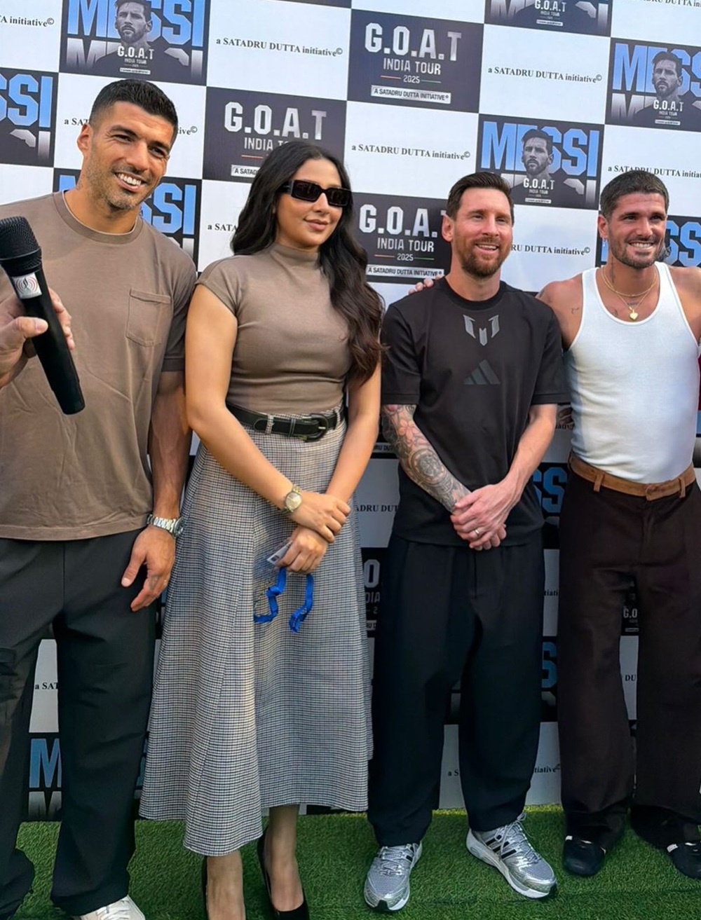 সল্টলেক স্টেডিয়ামে ‘গোট ট্যুর অব ইন্ডিয়া ২০২৫’ উপলক্ষে একফ্রেমে লুইস সুয়ারেজ, শুভশ্রী গাঙ্গুলী, লিওনেল মেসি ও রদ্রিগো দে পল।