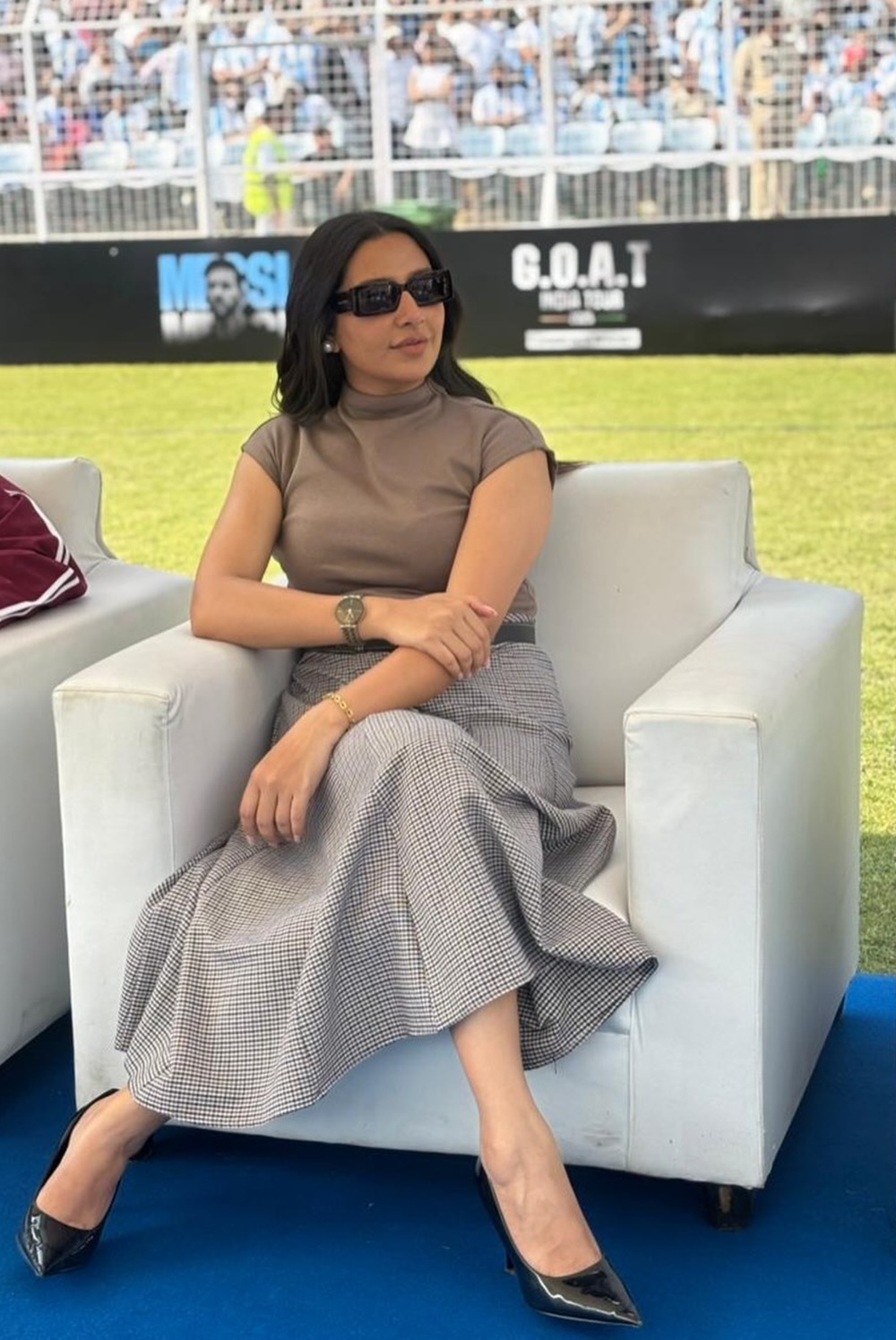 কলকাতার সল্টলেক স্টেডিয়ামে আজ (১৩ ডিসেম্বর) সকালে ফুটবলের রাজা লিওনেল মেসির সঙ্গে অভিনেত্রী শুভশ্রী গাঙ্গুলী।