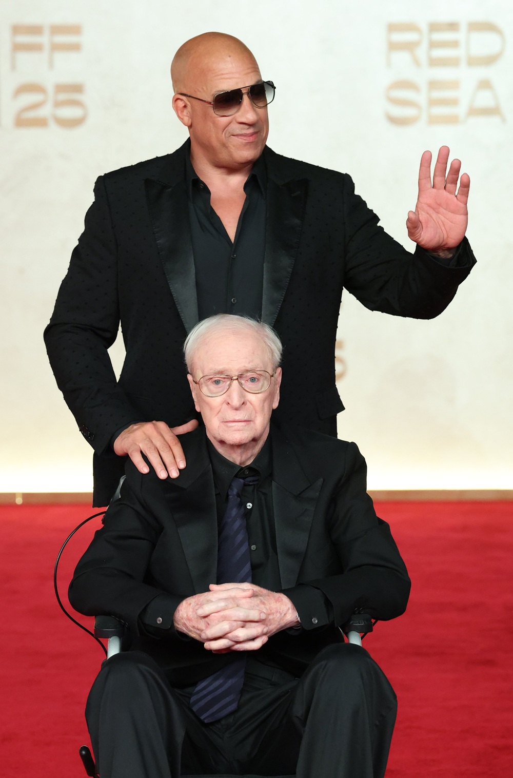 হুইলচেয়ারে দু’বার অস্কার ও তিনটি গোল্ডেন গ্লোব জয়ী ব্রিটিশ অভিনেতা মাইকেল কেইন, (পেছনে) আমেরিকান অভিনেতা ভিন ডিজেল (ছবি: রেড সি উৎসব)