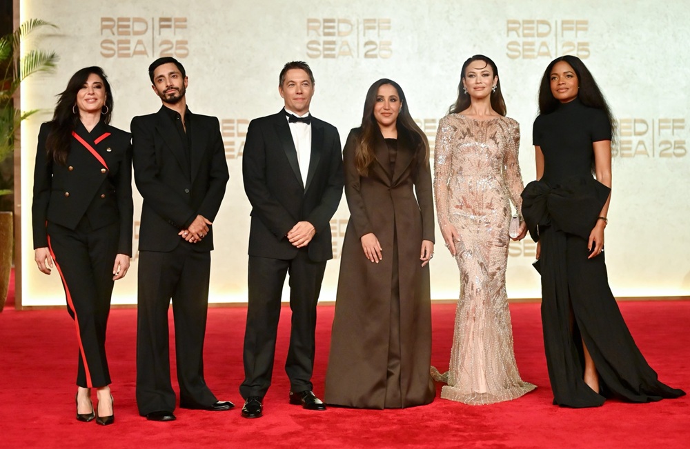 (বাঁ থেকে) নাদিন লাবাকি, রিজ আহমেদ, শন বেকার, রেড সি ফিল্ম ফাউন্ডেশনের চেয়ারওম্যান জমানা আল রশিদ, ওলগা কুরিলেনকো ও নায়োমি হ্যারিস (ছবি: রেড সি উৎসব)